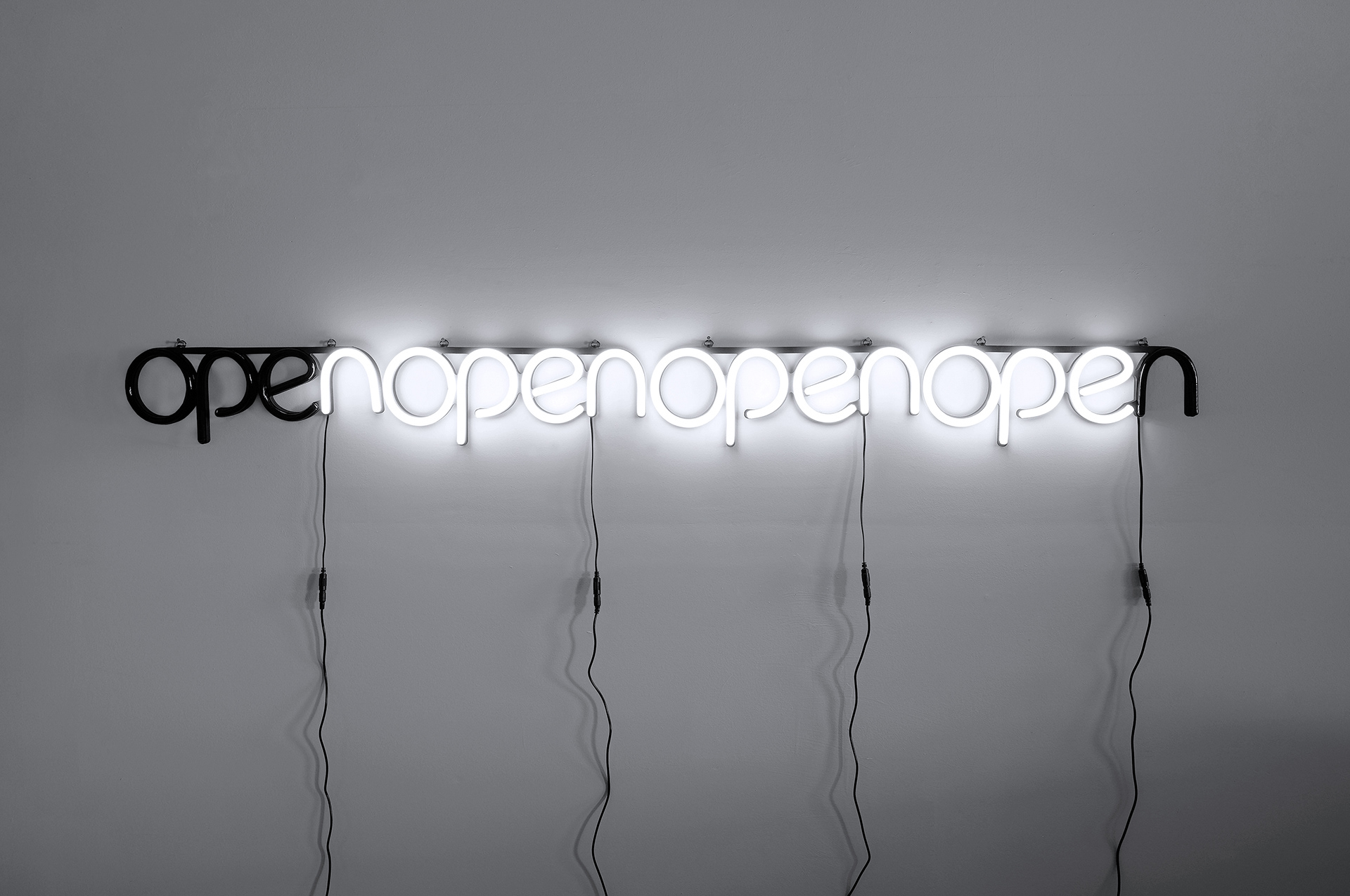 Border Nation is composed of four striking illuminated signs featuring bright white LED and neon lighting that spells out "OPEN." However, I creatively altered the presentation by painting the letters "OPE" in the first sign in black and the letter "N" in black on the fourth sign, resulting in the duality of "OPEN" and "NOPE." This clever manipulation of language encapsulates the tension experienced throughout the pandemic, where the desire for connection and normalcy clashed with the stark reality of closed spaces and community barriers.