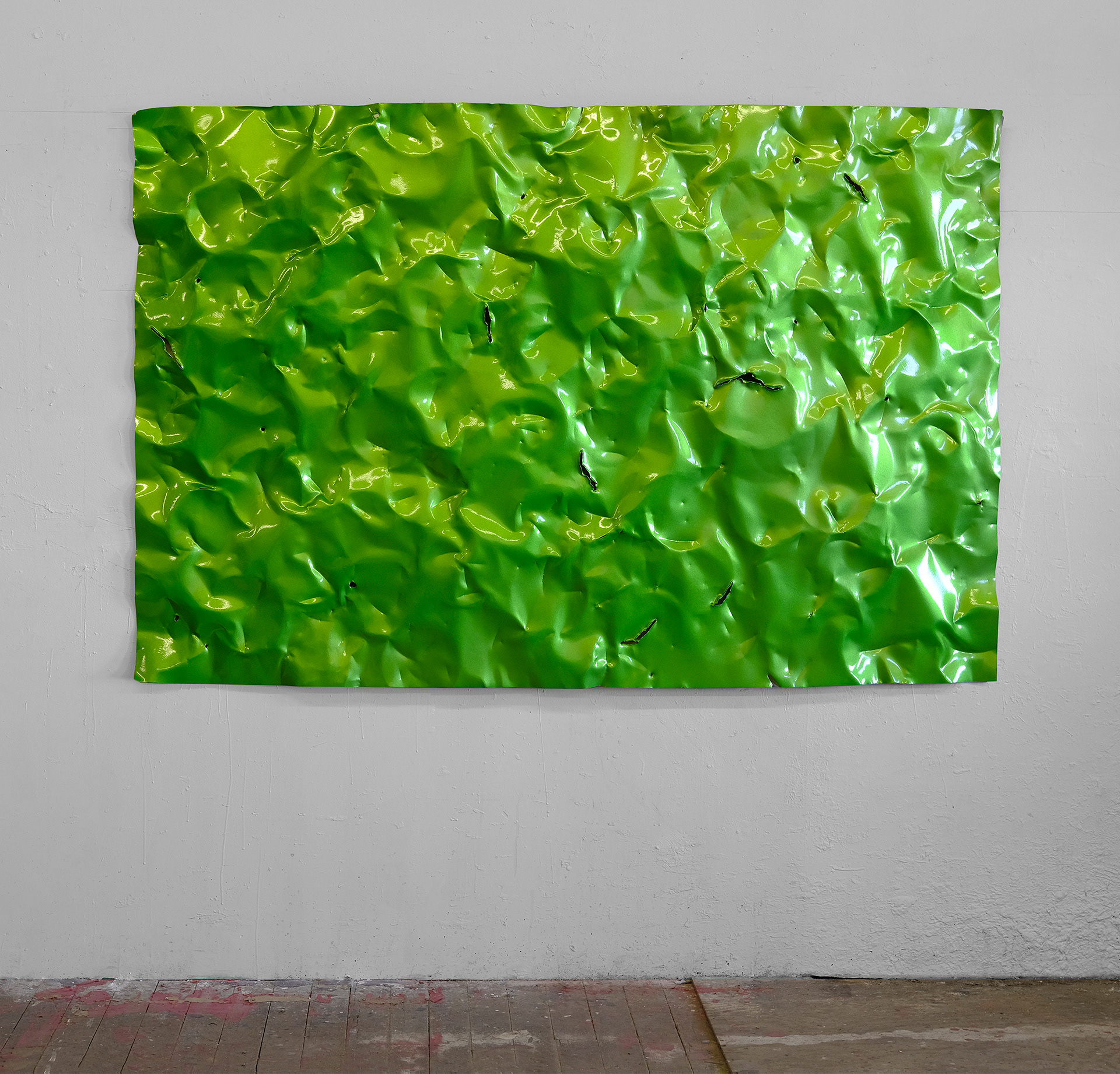 By hand-forming, piercing, and tearing cold-rolled 20 gauge steel, I’ve transformed a rigid industrial medium into something that feels fluid and alive. The piece is finished in a vibrant, dual-stage metallic green powder coating, creating a shimmering surface that highlights the physical history of every mark and opening in the steel.